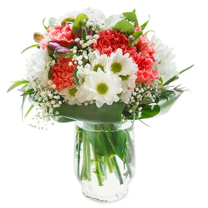 There's a radiant spirit within this bouquet, crafted by Enfield Town's florists and reminiscent of a joyful spring day in the community. Lush coral and peach carnations, layered with frilled and delicate petals, invite the viewer into a world of warmth and comfort-like memories of family gatherings by Enfield Town Park. White daisies with sunlit green-yellow centres pop amidst the arrangement, their presence reminiscent of pure happiness and laughter echoing down Silver Street. Graceful sprays of baby's breath drift between each main flower, softening the bouquet with their airy innocence and adding whispers of lightness akin to a gentle morning in nearby Forty Hall's gardens. Subtle purple-tipped buds appear along the left edge, adding a sense of new beginnings and depth to the overall design. All this beauty is encircled by a lush collar of deep green foliage, the broad, shiny leaves providing an embrace that is both grounding and elegant. Perfectly arranged within a square, crisp white bag-its ribbon handles ready for gifting or easy local delivery-every detail is enhanced by careful, natural lighting against an uncluttered white background. Ideal for milestones, celebrations, or just to share a heartfelt smile across Enfield Town, this bouquet reflects local expertise, artistry, and the joy of giving flowers from Enfield Town's trusted floral shop. 1502195140_l_99-900x900.jpg Radiating calm and joyful charm, this bouquet appears freshly gathered from Enfield Town's leafy avenues, as if shaped by the area's tranquil parks and bustling markets. Fluffy coral carnations form a vivid centrepiece, their ruffled textures alive with brightness and movement. Crisp white daisies open widely, each revealing a chartreuse-green core that sparkles like morning dew in Grovelands Park. Threads of featherlight baby's breath weave between the larger flowers, lending the ensemble an airy, cloud-soft silhouette. Hints of unopened magenta alstroemeria buds peek from the sides, offering promise and quiet intrigue. Generous, glossy leaves embrace the base, while slender greenery snakes throughout, grounding the bouquet's playful spirit in natural grace. Arranged in a simple, clear glass vase filled with water, the sturdy stems appear vibrant beneath the surface-a visual note of freshness and care typical of Enfield Town's best florists. The arrangement is washed in bright even light, set against an uncluttered white background that accentuates each detail, colour, and texture. Designed to mark celebrations, bring encouragement, or grace a sunlit windowsill on Church Street, this bouquet is a living tribute to Enfield's inviting, neighbourly warmth and the artful hands that bring local flowers to life.
